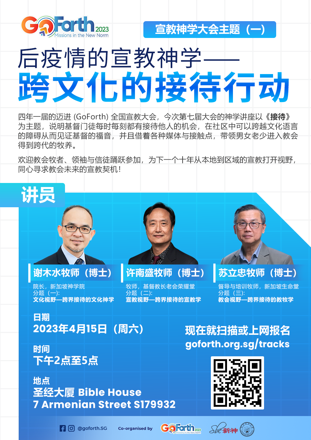 四年一届的迈进 (GoForth) 全国宣教大会,今次第七届大会的神学讲座以《接待》为主题,说明基督门徒每时每刻都有接待他人的机会,在社区中可以跨越文化语言的障碍从而见证基督的福音,并且借着各种媒体与接触点,带领男女老少进入教会得到跨代的牧养。欢迎教会牧者、领袖与信徒踊跃参加,为下一个十年从本地到区域的宣教打开视野,同心寻求教会未来的宣教契机!